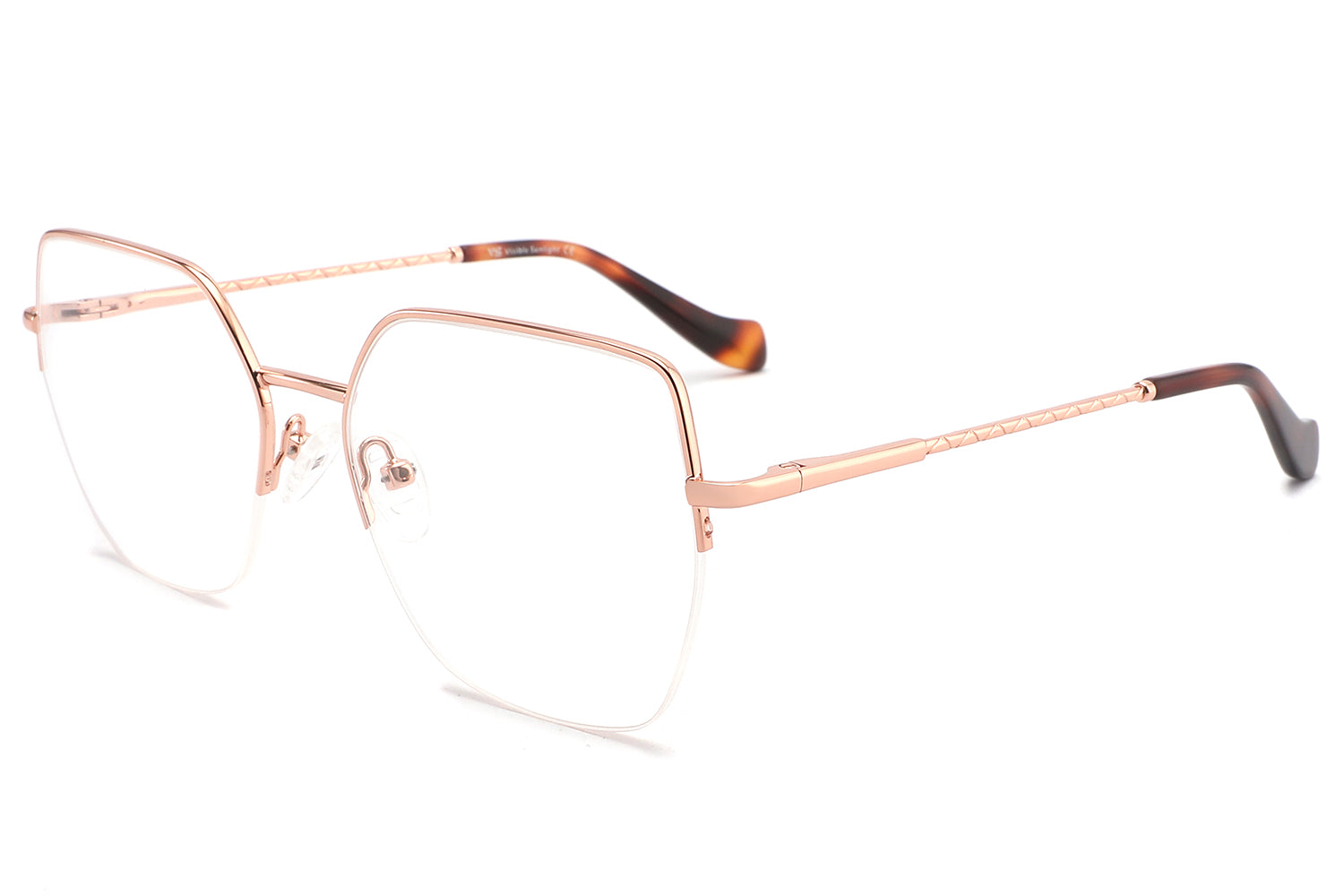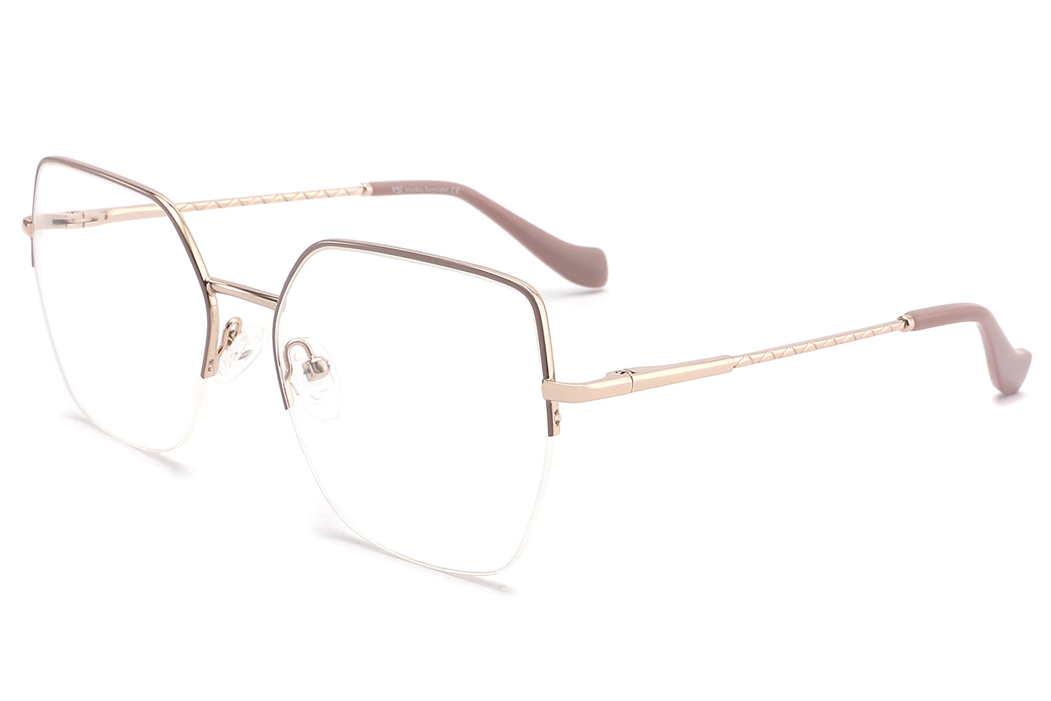 - Design: Unique geometric shape with soft blush-tone temple arms, offering a feminine and fashion-forward appearance.